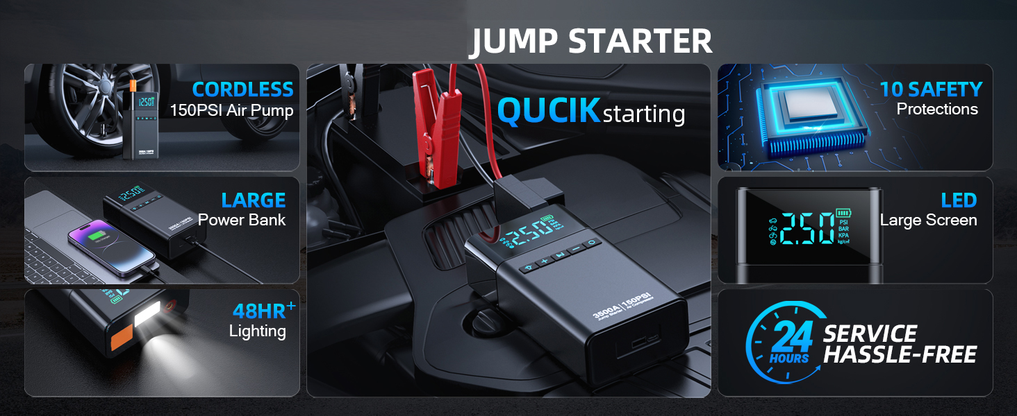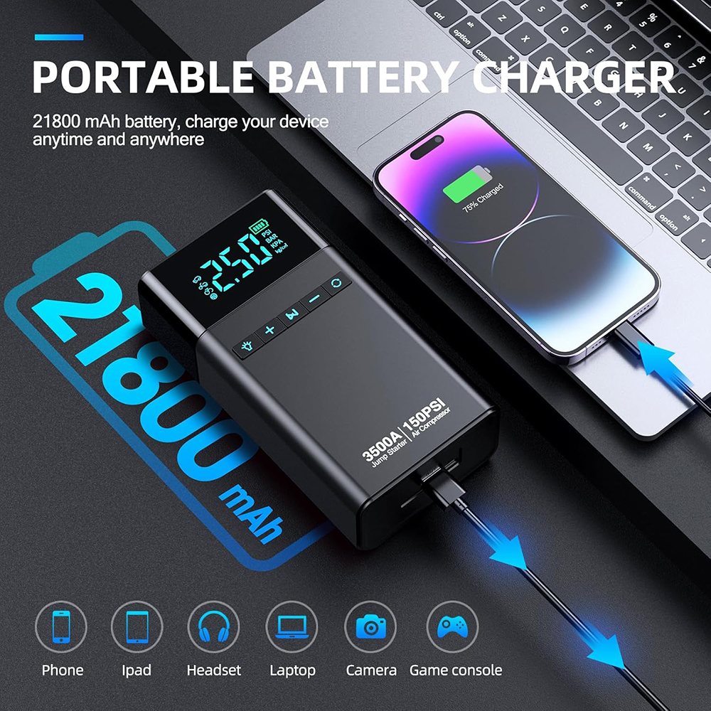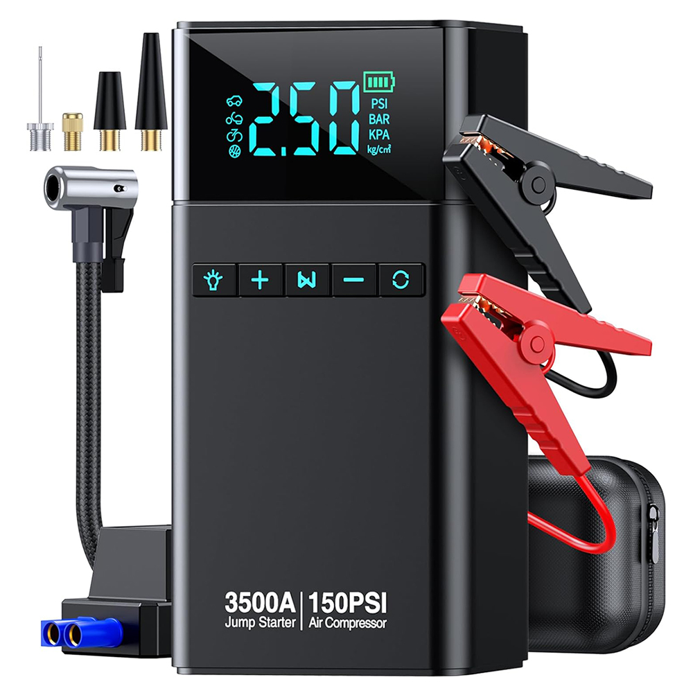 便携式智能汽车充气机轮胎泵12000mah电池与跳线起动器150psi12v汽车充气泵和跳线起动器