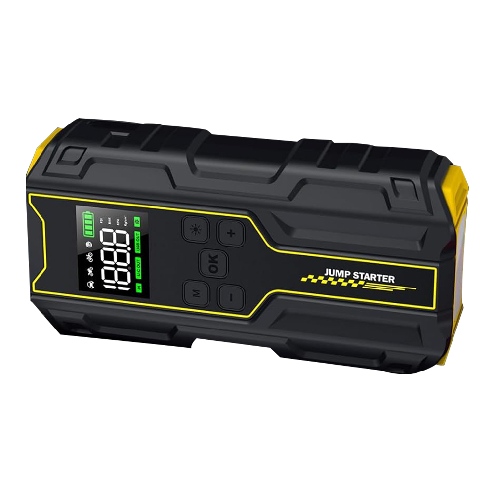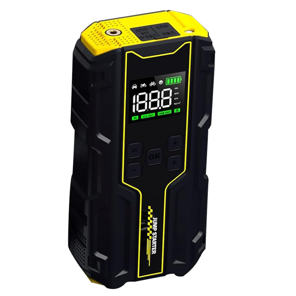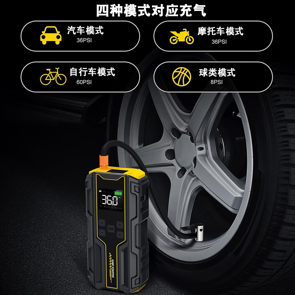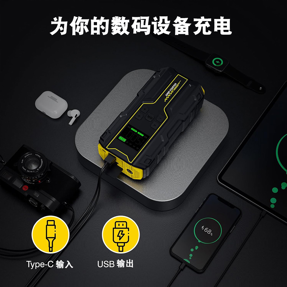 便携式空气压缩机: 这款带有空气压缩机的便携式汽车跳箱启动器配备了可拆卸的延长空气软管。您可以使用它来给轮胎、游泳圈以及大多数类型的球充气。应急电源还配备了用于实时数据读取的 LCD 显示屏、预设功能以及四种可选的单位更改功能,使用起来更方便、更安全