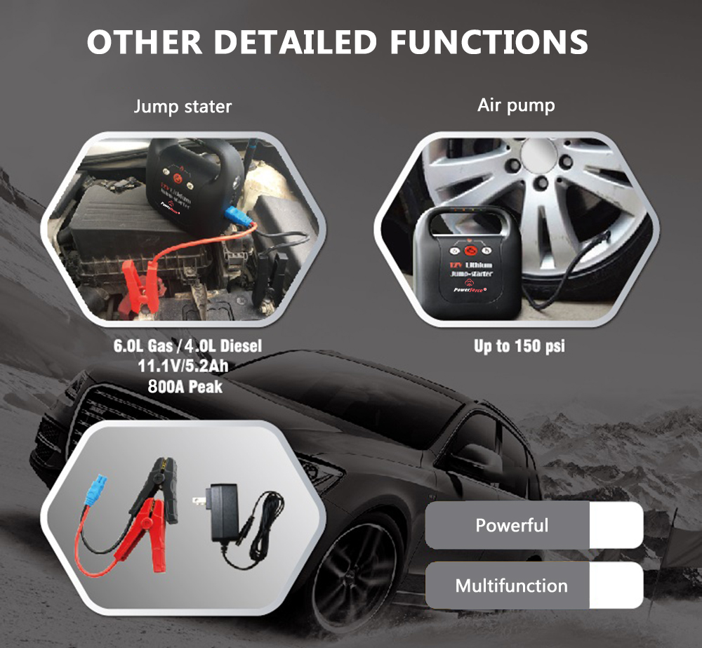 3 in 1 car jump starter with built in compressor 800A peak current booster batteries auto