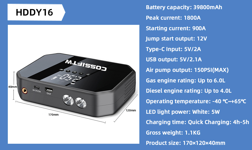 Compact & Powerful: The HDDY16 combines the power of a jump starter and air pump in one sleek, compact device.