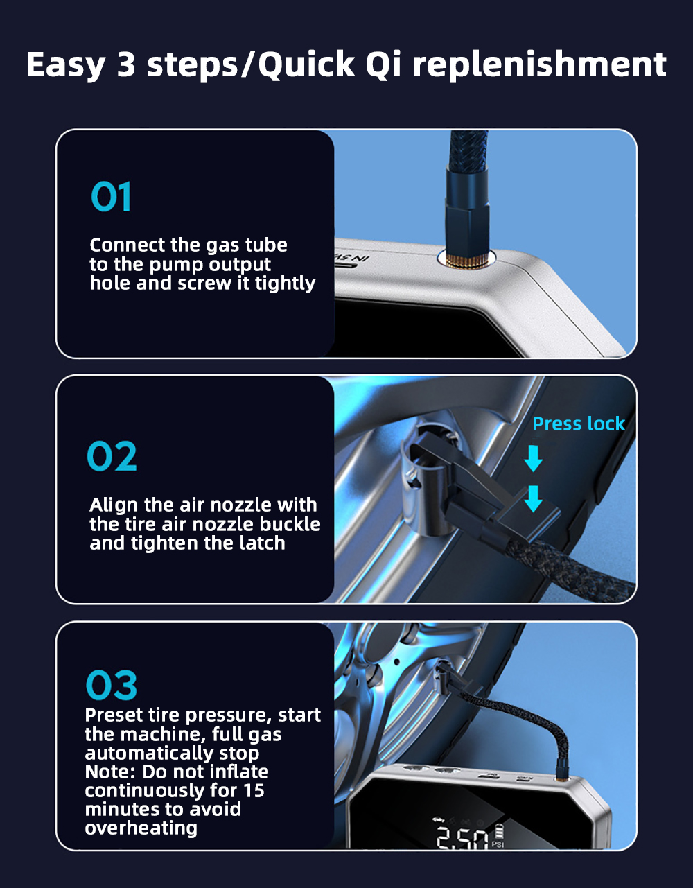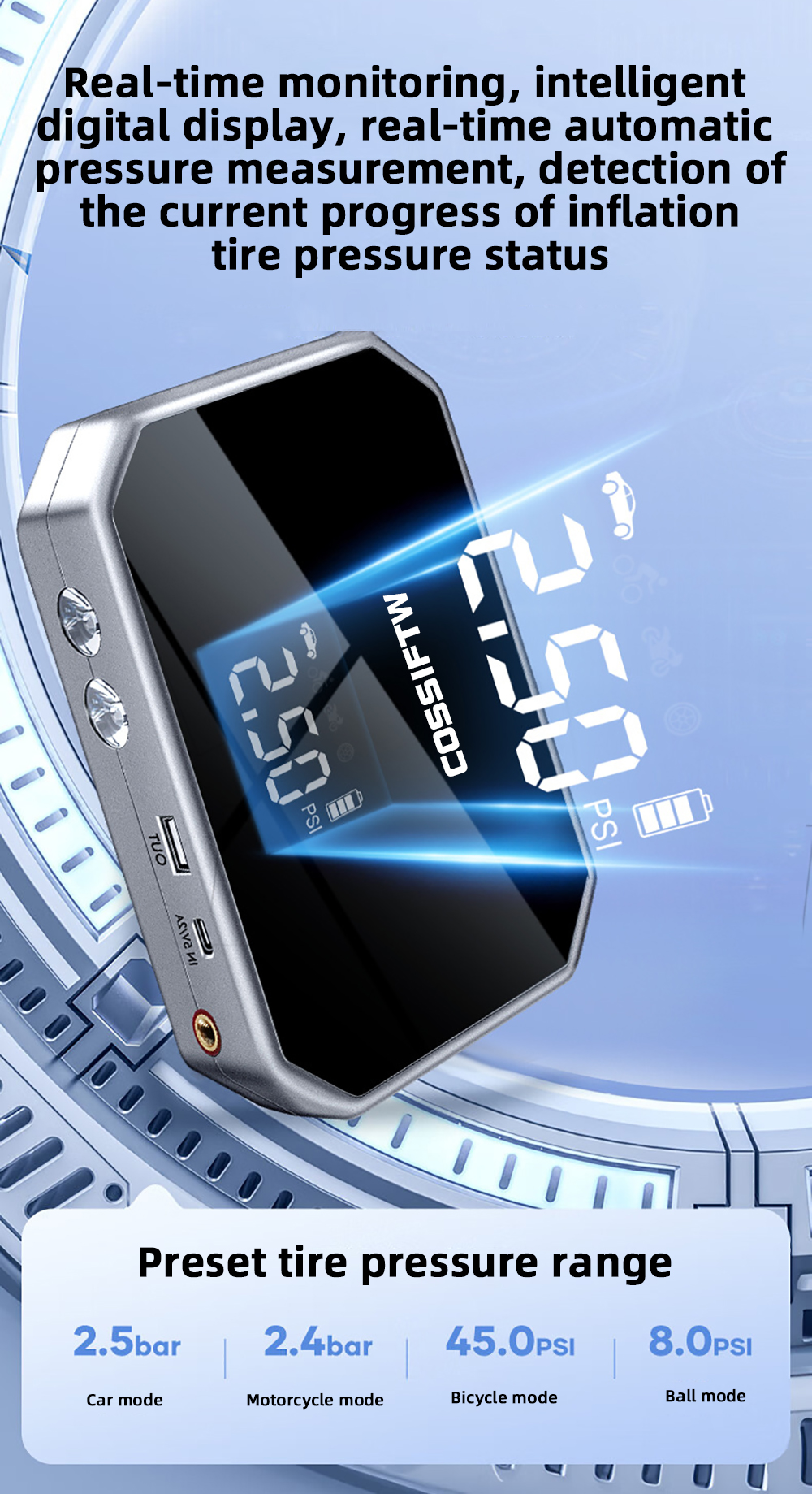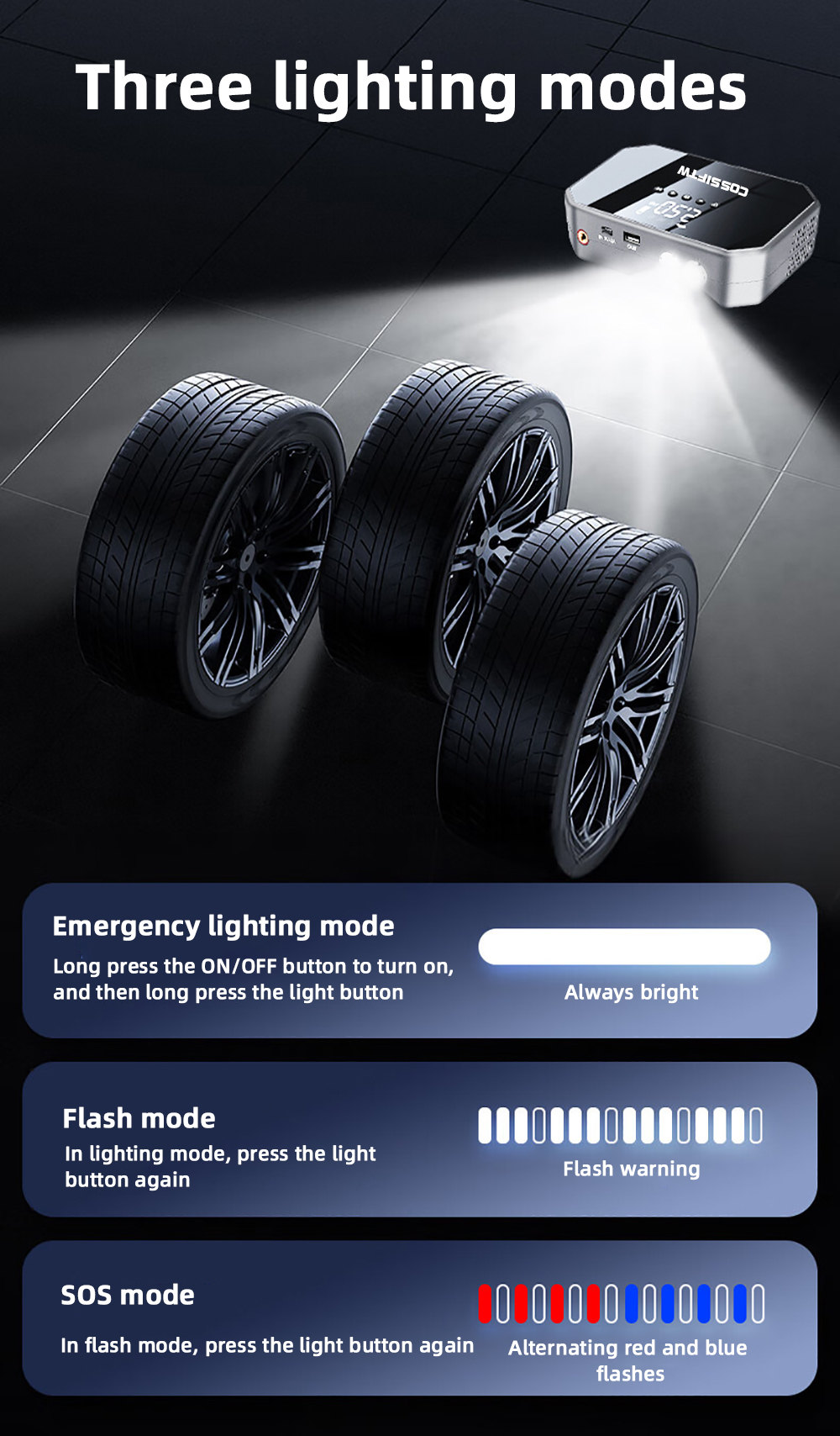 Tire Inflation: Inflate tires with ease using the built-in 150PSI air pump. Great for vehicles, bicycles, and inflatable products.