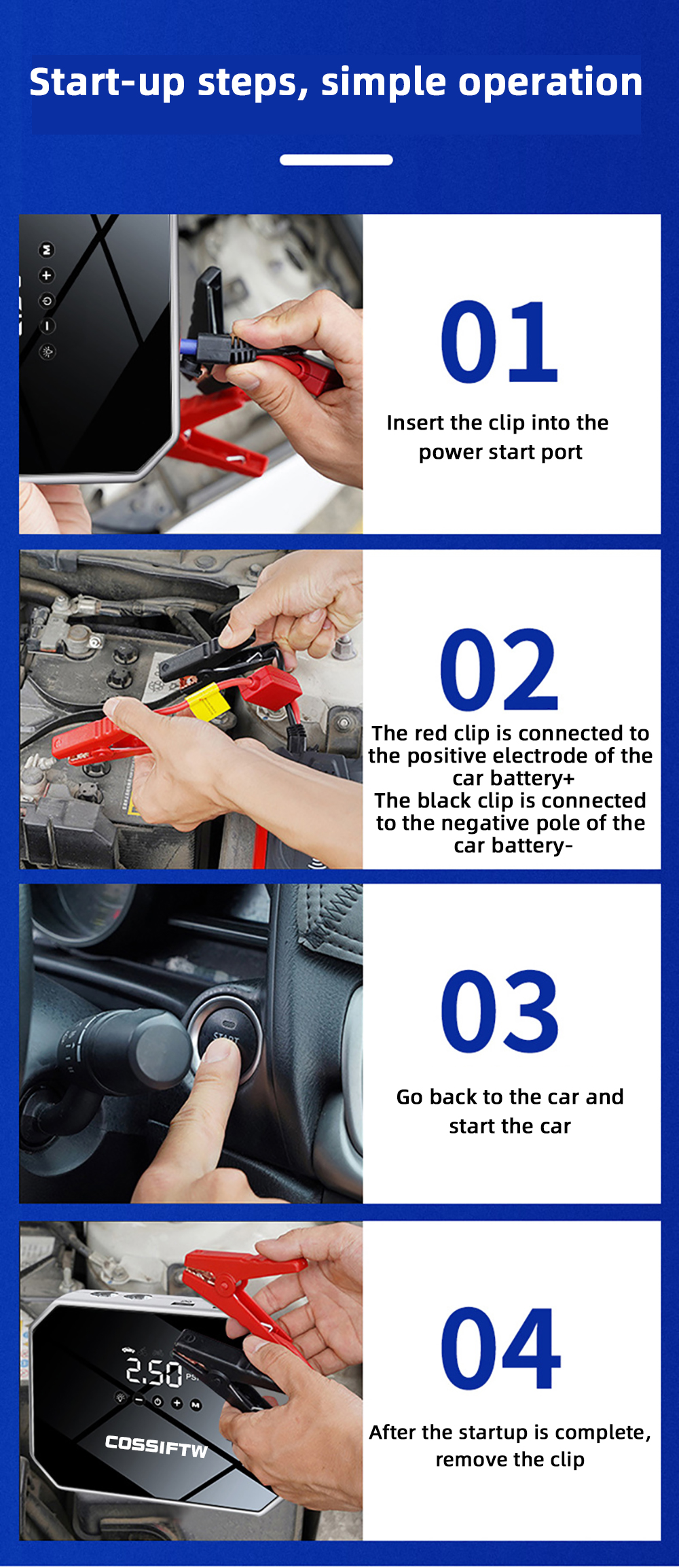 Car Jump Start: Jump-start your 12V gas or diesel vehicles, including cars, trucks, motorcycles, and more.