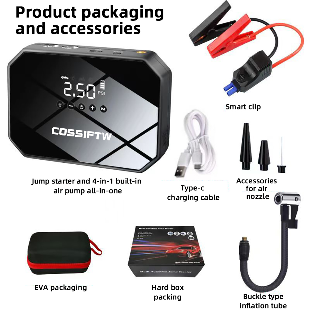 With a powerful 39800mAh battery, this device can quickly jump-start your car, motorcycle, or truck and inflate your tires, all while being compact and easy to store.