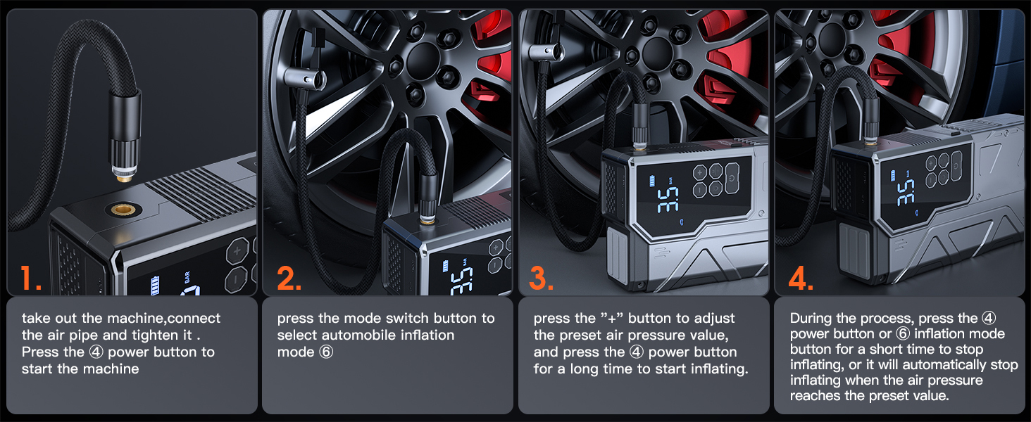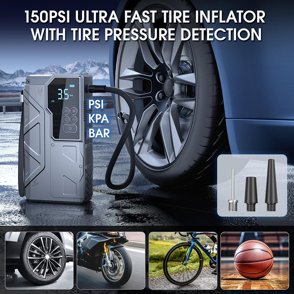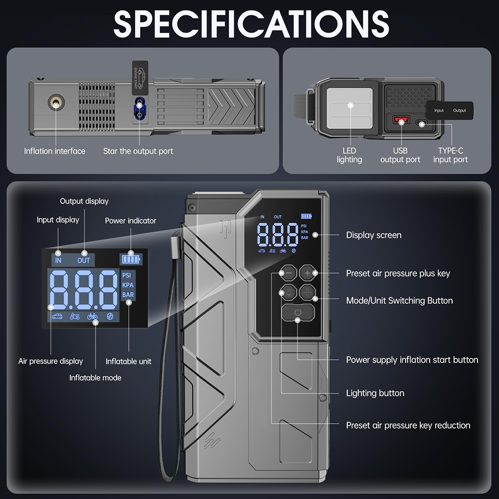 【150PSI Tire Inflator with Tire Presssure Detection】 -- This car battery jump starter built-in air pump supports 4 modes: cars, motorcycles, bicycle, balls etc and the 3 unit switching: BAR, KPA, PSI. It also support tire pressure detection function, connect the air pipe to the corresponding interface of the machine,the display screen will display the current tire pressure data