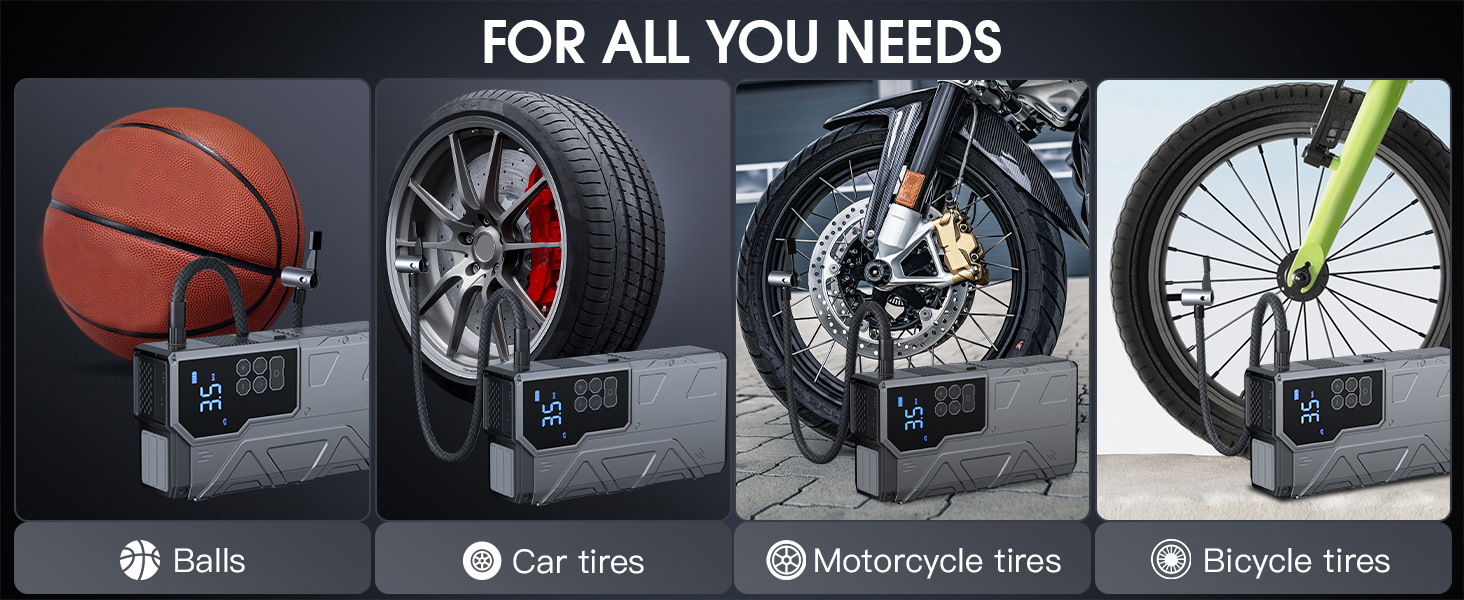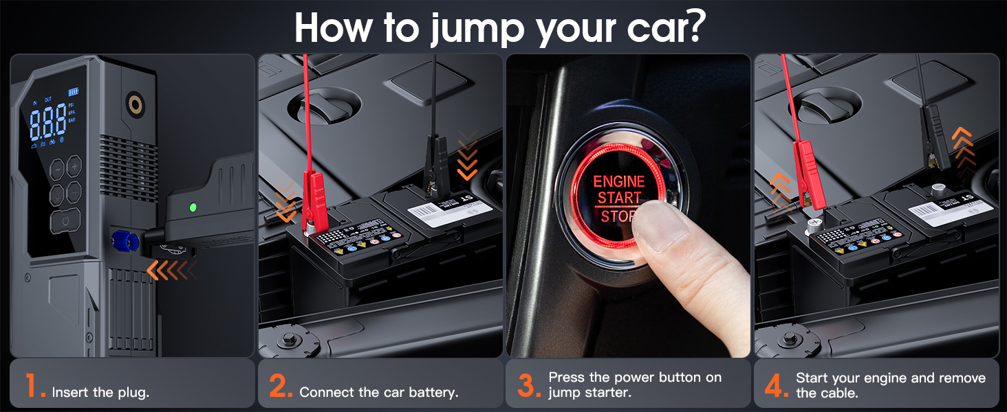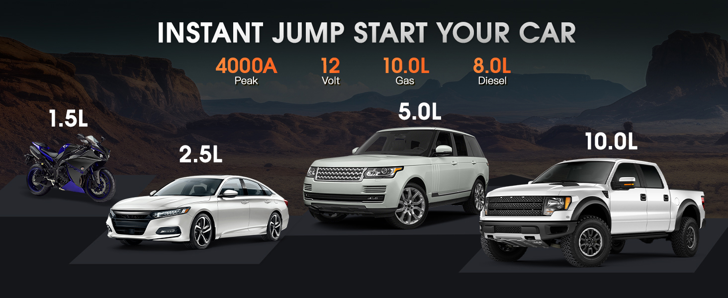 【Jump Starter with Air Compressor】 --RX002 jump starter. Instantly start your car in seconds when the 12V vehicles battery is out of power (up to 10.0L gas and 8.0L diesel engines). It also support the tire inflations function