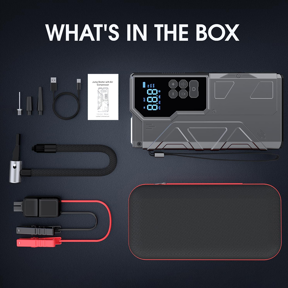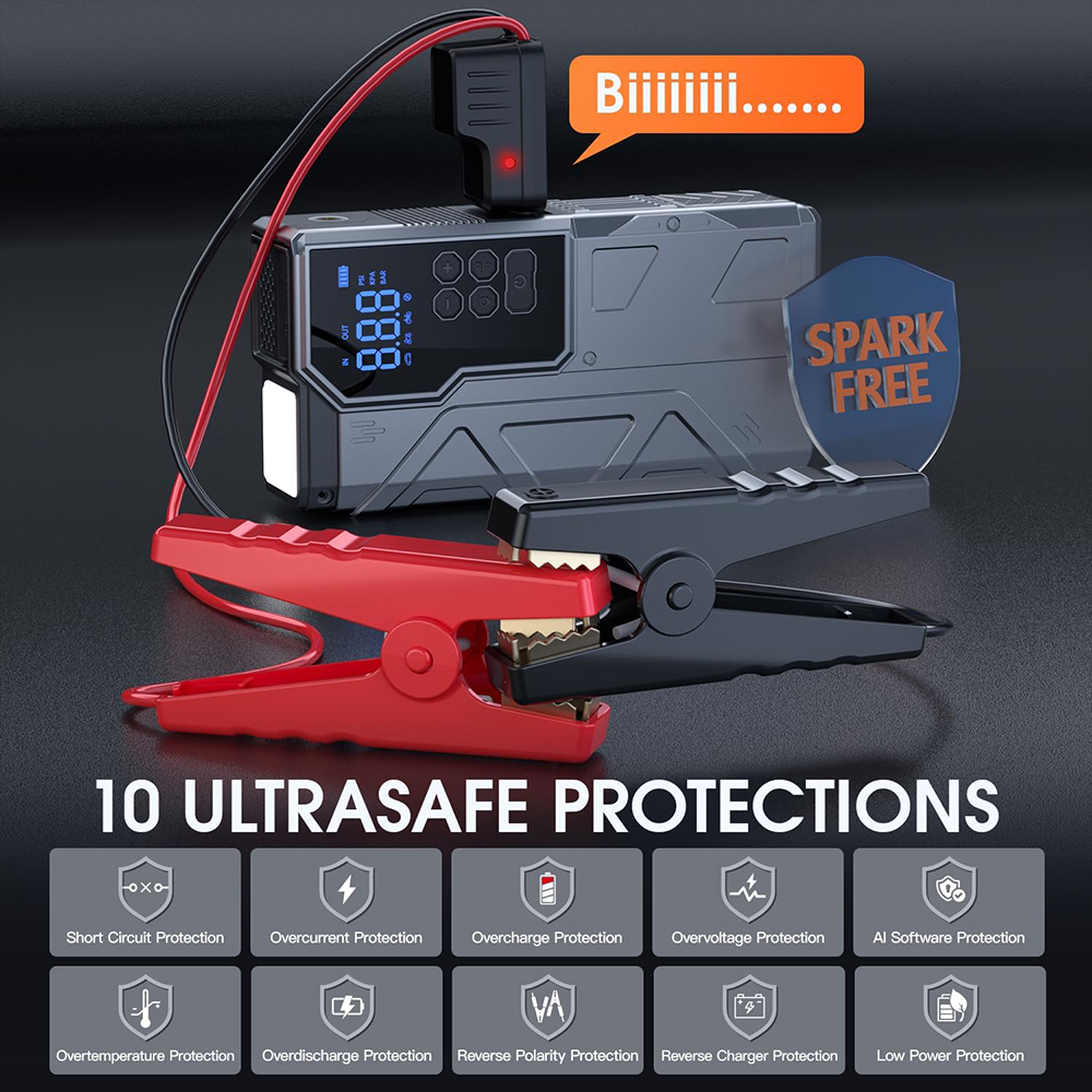 【10 Safty Protections】 -- This Lucklike upgraded W210 jump starter with air compressor built-in 10 safety protection technologies (Short Circuit Protection, Overtemperature Protection, Overcurrent Protection, Overdischarge Protection, Overcharge Protection, Reverse Polarity Protection, Overvoltage Protection, Reverse Charger Protection, Al Software Protection, Low Power Protection), and the jumper cables is auto-detect connection with no sparks, 100% safe