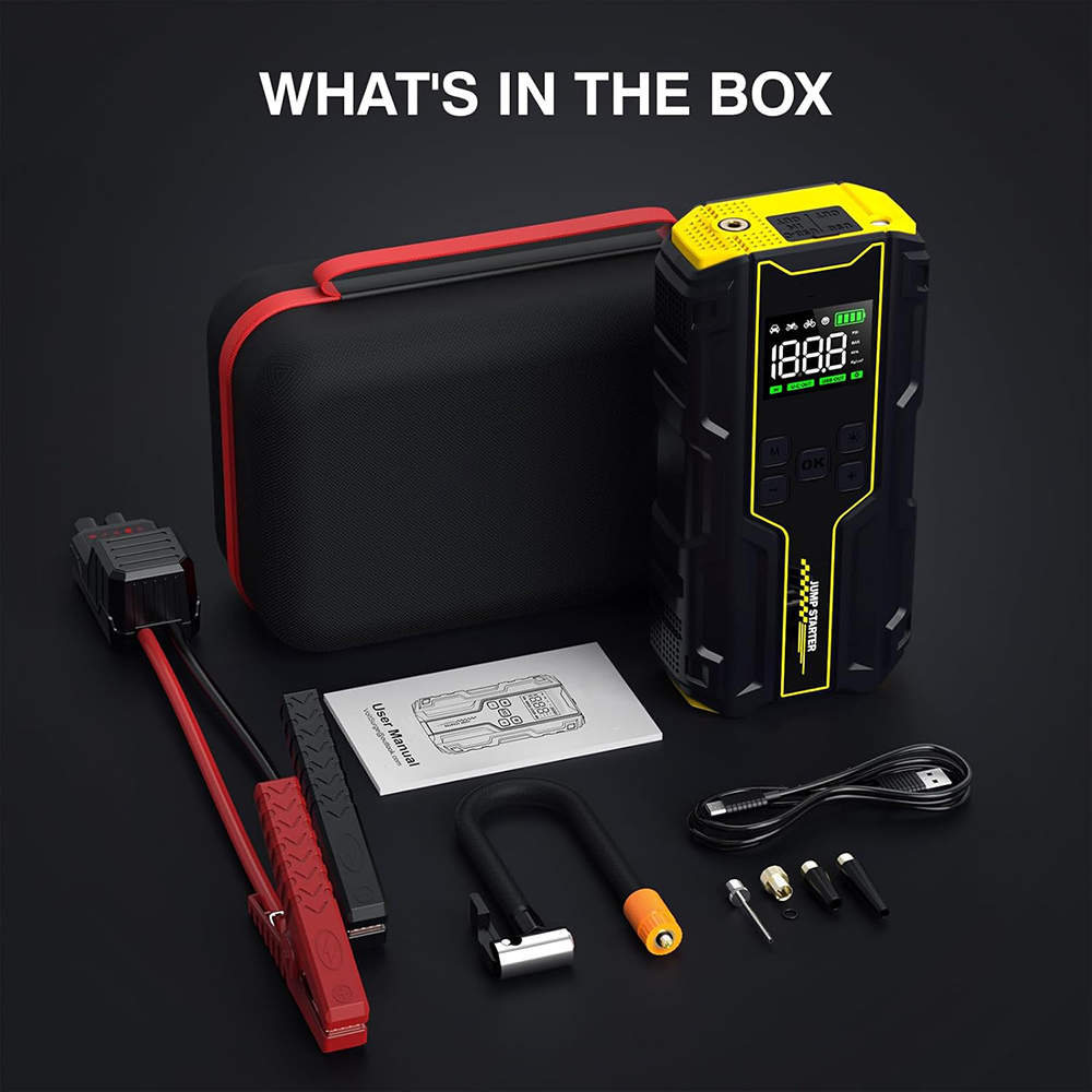 Best guarantee: The RX017 jumper start battery pack comes with 8 safety protection modes, so you don't need to worry about any potential hazards.Our accessories include an EVC storage box that can store all the accessories of the car battery starter and air compressor, making it more convenient for you to carry.If you encounter any problems with the console or accessories during use, please feel free to contact us