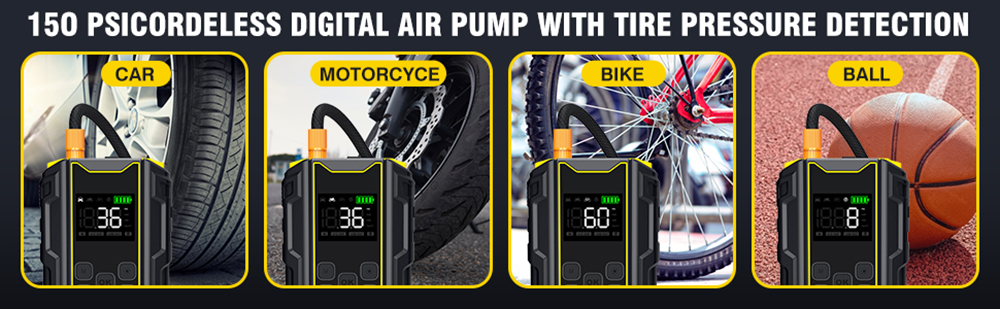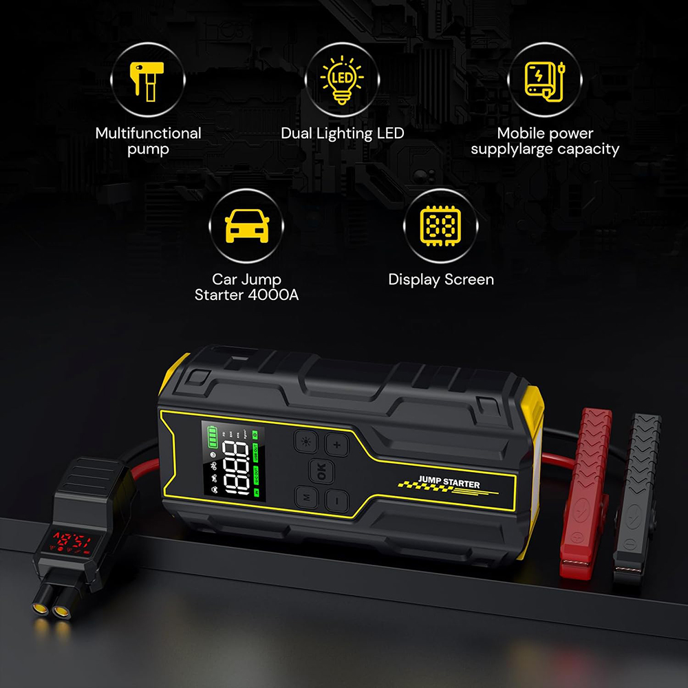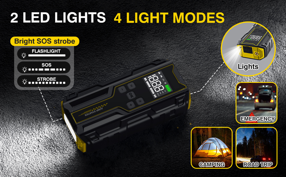 Portable air compressor: This portable car box starter with an air compressor is equipped with a detachable extension air hose.You can use it to inflate tires, swimming rings, and most types of balls.The emergency power supply is also equipped with an LCD display for real-time data reading, preset functions, and four optional unit change functions, which are more convenient and safer to use.
